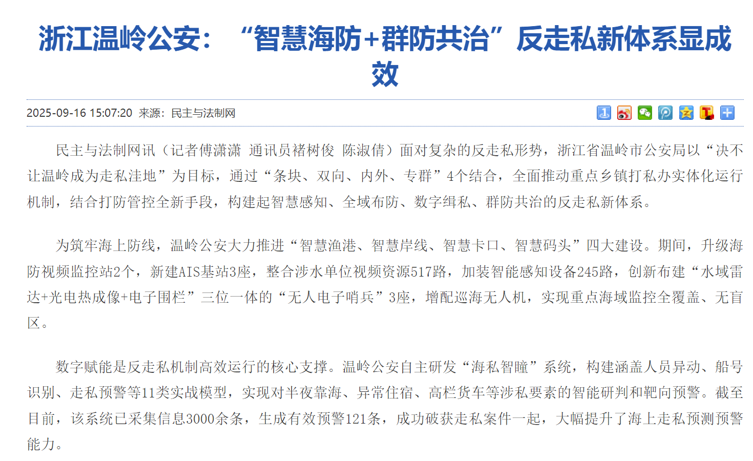 浙江温岭公安:“智慧海防+群防群治”反走私新体系显成效