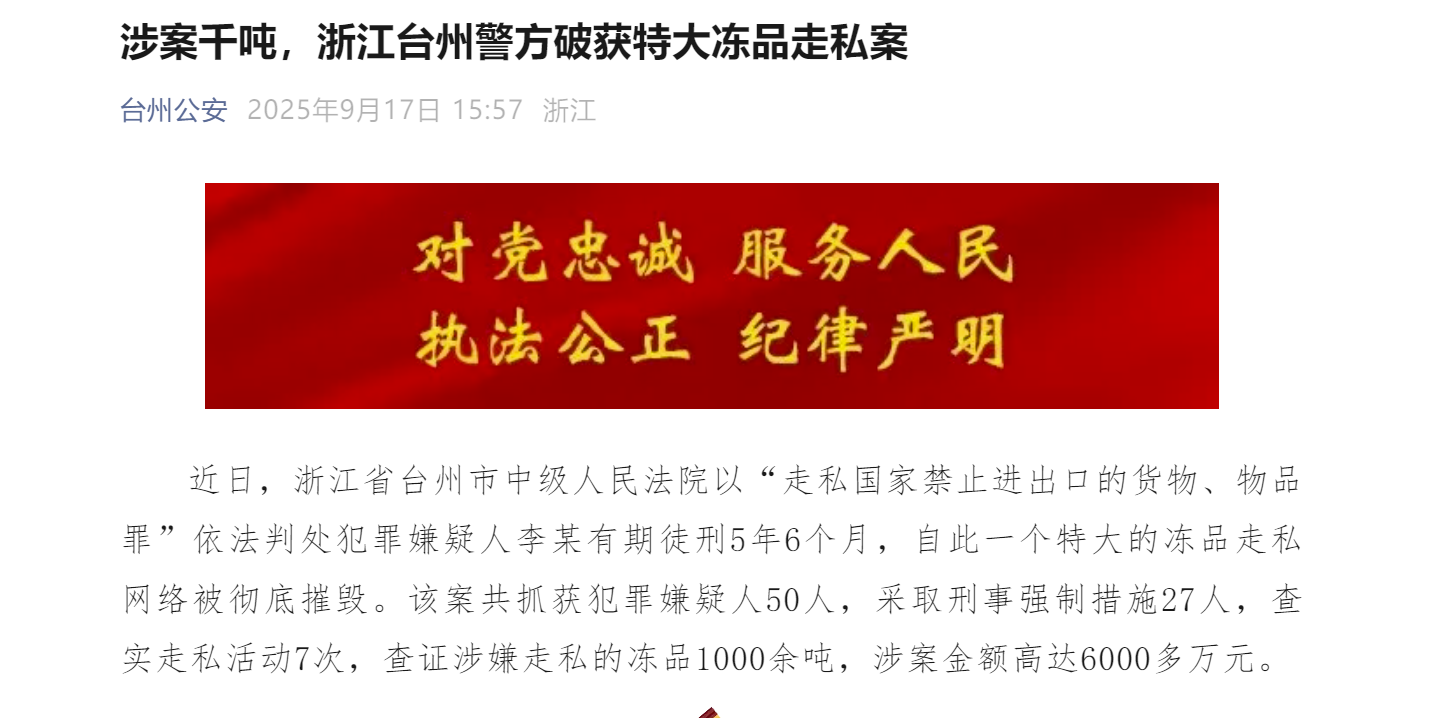 涉案千吨,浙江台州警方破获特大冻品走私案